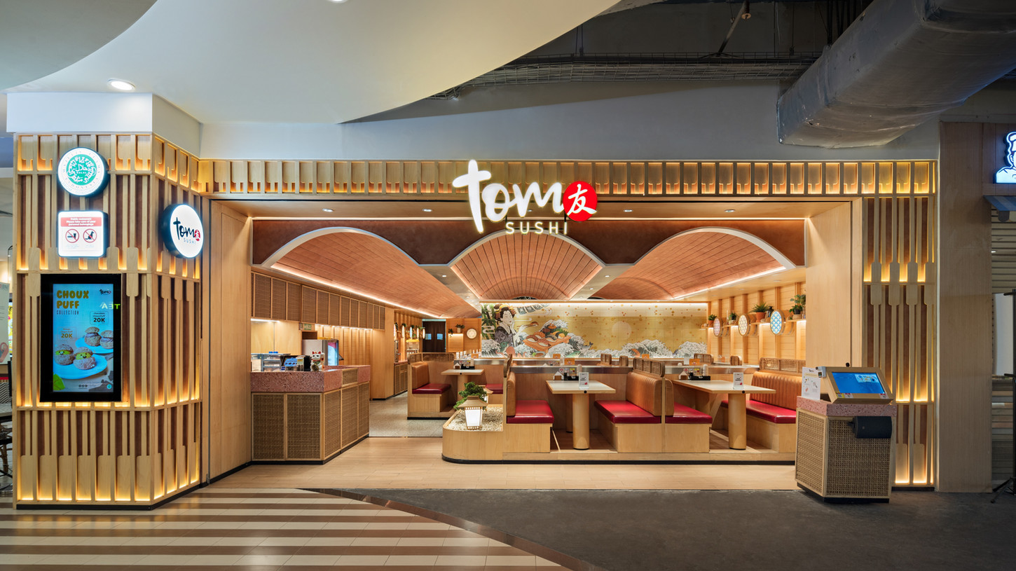 Tom Sushi embraces the Kaitenzushi concept with a colorful, modern twist. The contemporary design reflects innovation and joy, creating a vibrant atmosphere where sushi is not only accessible but also an affordable, happy experience.